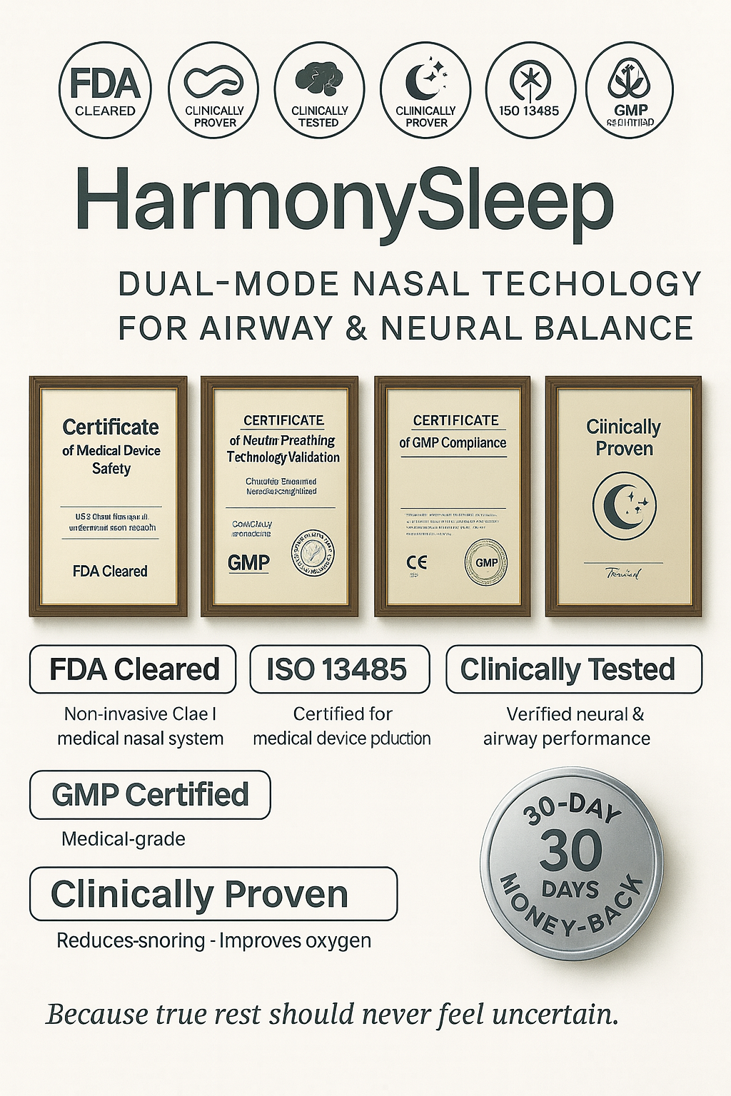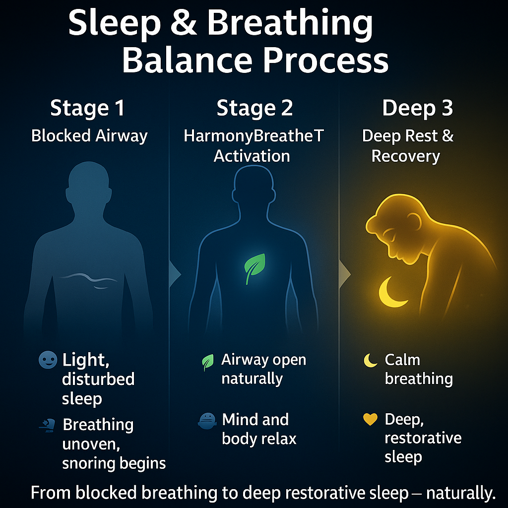 HarmonySleepยฎโs dual-mode formula โ Daytime Activation and Nighttime Restoration โ gradually strengthens the neuro-muscular feedback pathway, allowing the airway muscles to regain tone and coordination.