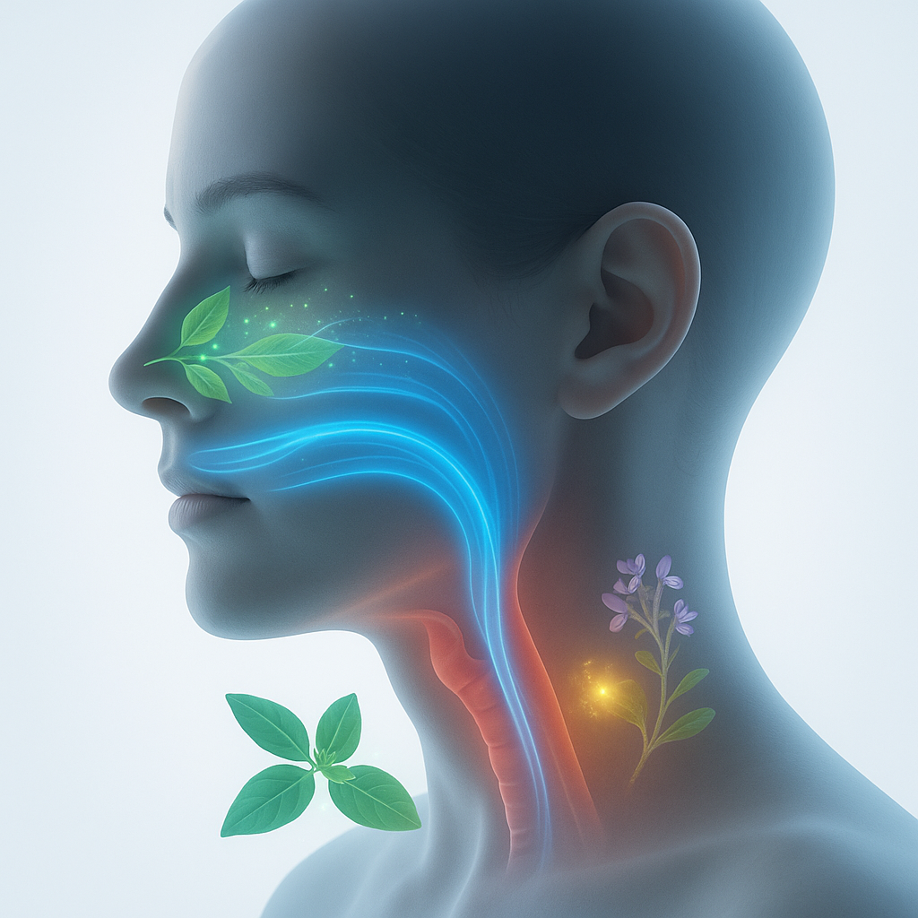 When inhaled, volatile molecules such as Eucalyptus 1,8-Cineole and Menthol rapidly stimulate the olfactory and trigeminal nerve endings inside the nasal cavity.